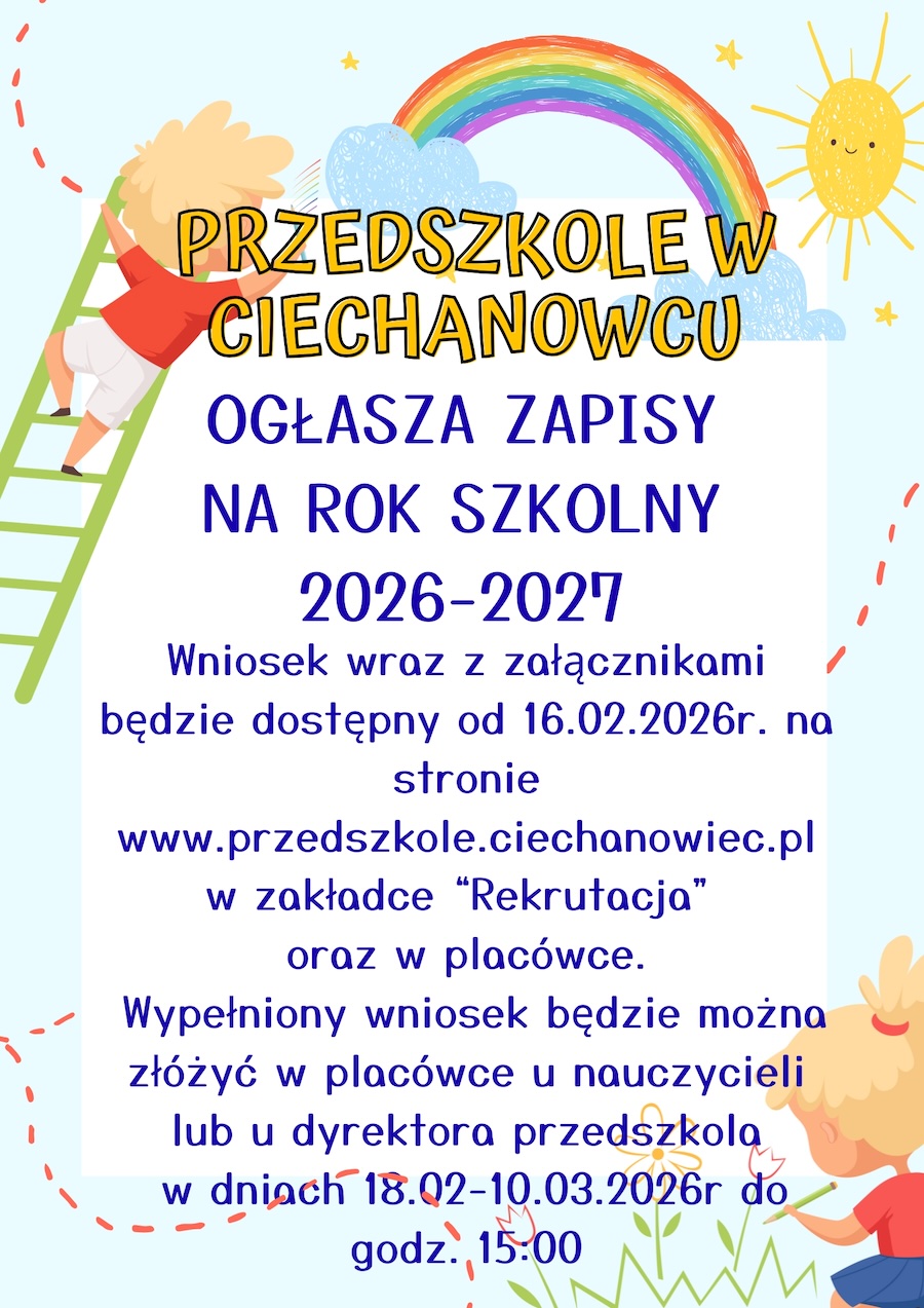 Rozpoczyna się proces rekrutacji do Przedszkola w Ciechanowcu na rok szkolny 2026/2027. Wypełniony wniosek należy złożyć u dyrektora Przedszkola lub nauczycieli w terminie od 18 lutego do 10 marca 2026 roku do godz. 15.00